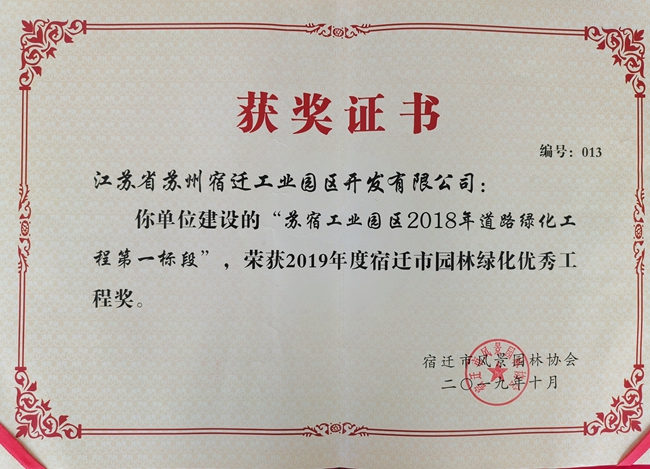 蘇宿工業(yè)園區(qū)2018年道路綠化工程榮獲“2019年度宿遷市園林綠化優(yōu)秀工程獎”稱號