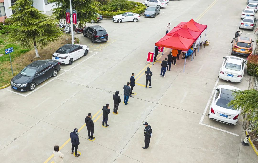 圖為3月21日,工業(yè)坊廠區(qū)各企業(yè)開(kāi)展第二輪核酸抽檢工作,對(duì)保潔、保安、食堂工作人員做到每日一檢,工業(yè)坊各企業(yè)每天抽檢總?cè)藬?shù)的20%,做到一周內(nèi)全員應(yīng)檢盡檢。