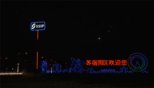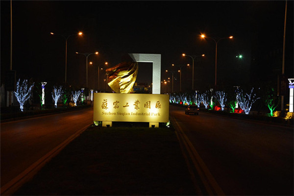 在園區(qū)東入口為民河的一畔,一座座生動的城市剪影燈光造型在青海湖西路兩側(cè)一字排開。有象征著新加坡元素的“魚尾獅”,有蘇州工業(yè)園區(qū)金雞湖畔的東方之門、摩天輪和李公堤,還有西楚霸王項(xiàng)羽騎馬的颯爽英姿。造型以蘇州、宿遷和新加坡城市建筑輪廓線、城市主題雕塑為基本元素,以剪影形式為載體,以現(xiàn)代高科技LED燈光為表現(xiàn)手段,通過炫麗動感的光影效果,在夜色中描繪出了一副靚麗多姿的畫卷,生動地展現(xiàn)出了園區(qū)“從新加坡到蘇州再到宿遷”和“在宿遷、為宿遷”的發(fā)展理念。