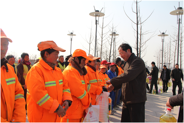 在慰問現(xiàn)場,周原與城市維護工人親切握手,向他們送上了米、面、油等慰問品,感謝他們一直以來為蘇宿園區(qū)城市維護工作付出的辛勤勞動,并衷心祝愿他們春節(jié)快樂、身體健康,闔家幸福。